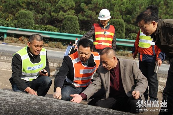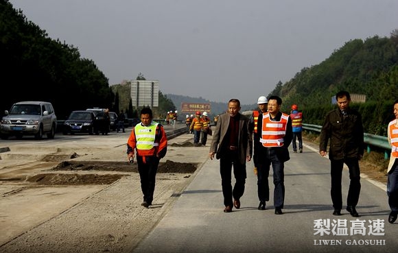 11月18日,总公司纪委书记、党委副书记刘楚有深入梨温高速,察看梨温路面工程建设情况,总公司监察室主任郭伟,该项目办副主任熊洪林、付群等陪同。