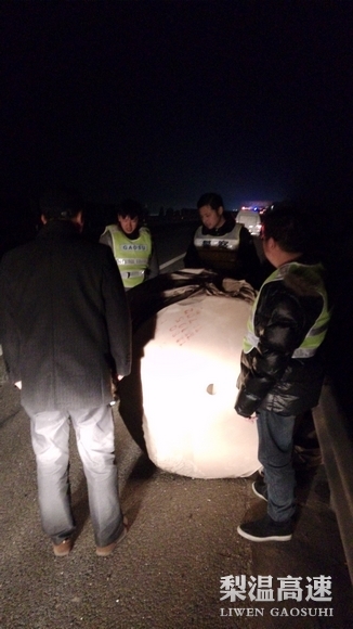 该物挡住整整半幅路面,在昏暗的夜幕中形同一只拦路虎,对夜间路面行车造成极大安全隐患。该养护所员工随即展开了紧急清障行动,摆放安全警示标志、组织人员指挥过往车辆,并将这卷牛皮纸迅速清理至硬路肩装车运离高速公路,半小时后彻底排除了路面安全隐患。