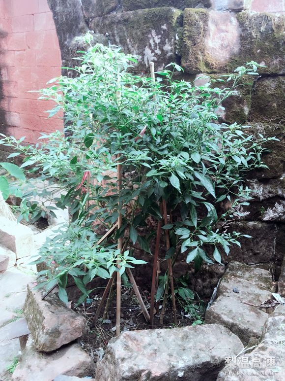 门前角落的一株辣椒秧却十分抢眼,它被磐石围护,枝干挺直,枝叶碧绿,开满小花,长势是通常菜地里辣椒秧的3-4倍,十分茂盛。吴奶奶告诉我们,辣椒秧是自己破土而出的,她搬来些石头做护栏,时常给它浇浇水,用捡来的竹竿搭支架(当时我也数了数,长短不一的竹竿足有7根),帮助辣椒秧挺直茂盛生长。