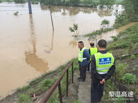 5月10日,梨温公司总经理助理付群赴梨温高速鹰潭段察看指导养护防汛工作,安监处负责人陪同。