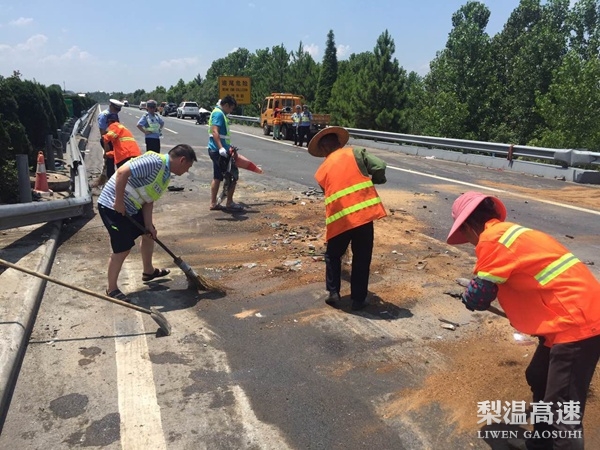 近期,午间温度数日达36℃以上,地表温度高达50℃。在气温“高烧不退”的情况下,南昌南管理中心养护人员发扬“能吃苦、能战斗、能奉献”的精神,恪尽职守,埋头苦干,确保辖区内的高速公路安全畅通。当高速公路出现车辆抛锚或交通事故等突发事件时,养护人员们既当指挥者,又当急救员,他们头上顶着烈日暴晒无任何遮挡,脚下忍受着路面烘烤,隔着鞋,脚底都感觉发烫,为消除安全隐患,防止次生事故的发生,他们指挥、引导、疏通、清障……他们用连续工作造成的嘶哑声音提醒驾驶员注意安全。一切处置完毕后,被汗水一遍遍浸透的衣服都拧得出水来。