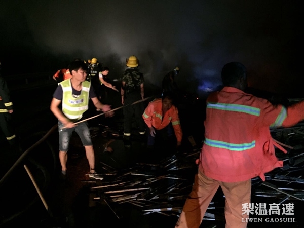 8月30日晚8时许,一辆满载木材的重型牵引挂车途径沪昆高速梨温段K542公桩往上海方向时因后侧轮胎起火引燃整车木材,导致该路段车辆无法通行情况十分危急。南昌南管理中心上饶养护所协同上饶武警消防、辖区高速交警、路政迅速赶赴现场处置。