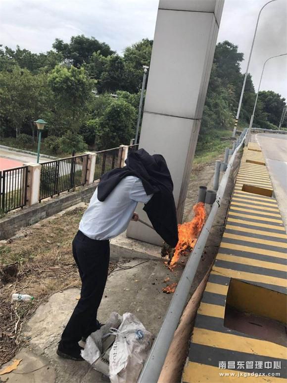 为及时消灭这群“不速之客”,保证在灭蜂过程中的人身安全,姑塘收费站迅速组织人员,采取“火攻”的方式,点燃棉布做成火把去将马蜂窝烧毁,并用外套套在头部防止被马蜂蜇到,几分钟后,地上这群密密麻麻的马蜂已全部被烧死。收费车道恢复正常工作秩序。