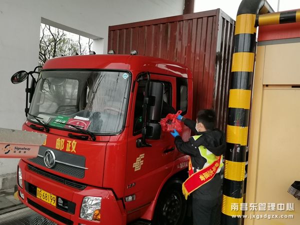 “师傅,辛苦了,这些是我们的一点心意,请您收下,一路平安!”突击队队员叶海鹏一边说,一边向司机递上准备好的面包和矿泉水。叶海鹏是上饶收费所的一名监控员,当天他刚刚结束了一轮倒班,下午就跑到车道上帮忙,队长劝他赶紧回房间休息,他说:“我还年轻,吃得消。现在运输物资的车辆增加了,大家都已经连续好几天都在车道上帮忙消毒,我也不能闲下来呀!”