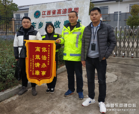 近日,抚州市东乡区公安局刑侦大队负责人带着一面感谢锦旗,来到省高速集团南昌南管理中心东乡西收费站,向该收费站工作人员表达感激之情。
