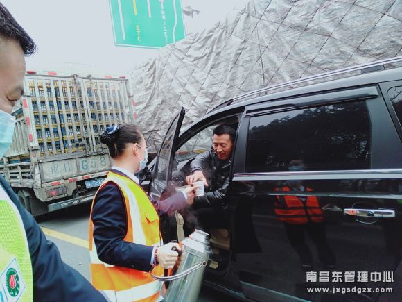 “您好,请问需要热水吗?”他们推着爱心服务车,免费为司乘人员送上热水、泡面、鸡蛋等应急食品。一句句热情的话语,一声声贴心的问候,舒缓了司乘人员急躁的情绪,换来一声声的感谢。
