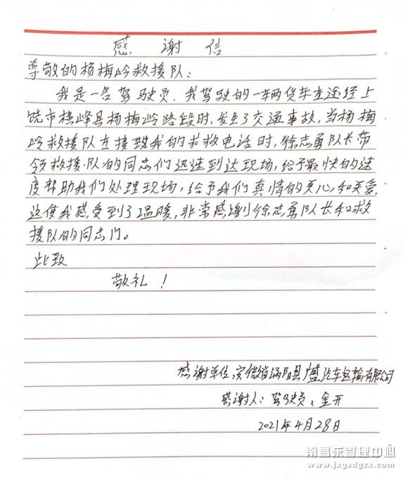 5月10号上午,c17官方网站清障救援队杨梅岭中队接到一个电话,电话那头传来一个声音:“你好,我是上次在你那边发生事故的司机,我现在就在你们停车场门口了,你们过来一下吧!我有东西要拿给你。”该中队队长张永义连忙赶往停车场,看到一辆皖牌大货车停在停车场门口,两位中年人在那等候,手上拿着一面锦旗和一封信,热情地握住张永义的手说道:“太感谢你们清障人员那天的热心帮助,这次正好路过这里,想当面再说一次谢谢!”