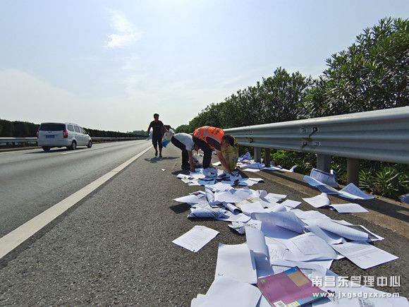 9月3日上午,南昌南管理中心志光养护站工作人员在日常例行养护巡查工作途中,巡查至往上海方向K585+100公桩处发现路边有大量散落的书籍和资料。有一辆货车靠边停在了高速路上的护栏旁,但是养护工作人员发现该车辆并未按照安全要求,在后摆放反光锥或三角架等预警设施,期间有3人正时不时在飞驰而过大货车流中捡落到行车道上的书本。看到这十分危急的情况,养护工作人员立即在该货车后方拉响了警报,安排了一个工作人员在后面预警和指挥交通,并帮助他们清理路面上散落的书籍和资料。