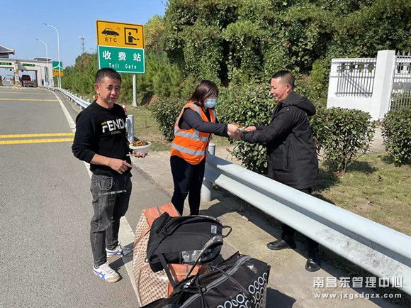 11月11日上午11时30分左右,两名行色匆匆的男子背着行李焦急的走向东乡西收费站。细心的值班人员发现后,立马拦截下来,并向前询问情况。得知两名男子是贵州人,经他人介绍到抚州市内搞装修,昨日装修完工后,今日便要返回家乡。人生地不熟的他们坐错了车,司机让他们在收费站下车,自行搭车去贵州。无奈,只能背着大包小包的行李往高速公路方向走去。