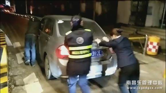 12月21日晚,南昌南管理中心鹰潭东收费站收费工作人员齐心协力帮助浙D392L1故障小轿车从匝道口推至出口广场安全处。