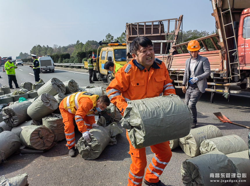该中队接警后立即赶赴现场,抵达后救援人员迅速摆好安全反光锥桶,设置安全区域,同时安排预警车辆在后方预警,准备施救。由于现场路面货物散落一地,造成双车道拥堵,加上路面车流量较大,为了尽快恢复交通,救援人员纷纷动手搬运,将单个重达150斤的货物搬上转货车,冬天的低温,也敌不过队员们的热情,个个头上冒热汗,现场热火朝天地搬运货物,经过大家的努力,10分钟后便疏导出行车道和应急车道,便于后方积压车辆缓慢通行。在大家的齐心协力下,12点零5分,现场散落货物全部搬运完,第一时间快速将行车道、应急车道货物转移。