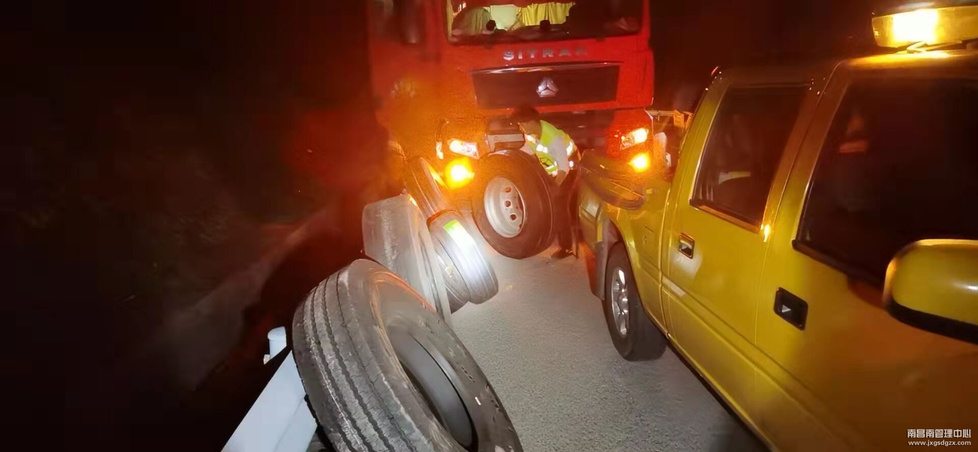 经询问得知,小皮卡司机为附近修理厂的一名员工,是货车司机爆胎后,通过网上搜索维修电话联系上的,平台收取了他2个轮胎5300元和人工费600元,一共为5900元。该修理人员已经将司机的轮胎卸下,正准备更换新胎时被东乡中队负责人撞见,且作业时未采取任何安全措施,情况非常危险,收费额也高得离谱,中队负责人当场责令网络平台退还车主所以费用,对修理人员进行批评教育,并通知高速交警前来处理。