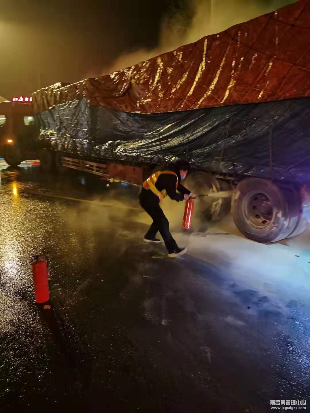 原来,2021年3月21日凌晨,一辆浙籍的半挂货车在通过弋阳收费站时,右后轮胎突然起火,当班班长吴志华发现情况后,立即冲出岗亭,指挥示意司机驶出车道,同时拿起灭火器对着火部位进行灭火,经过15分钟的不懈努力,最终成功帮司机挽回了200余万的货物。