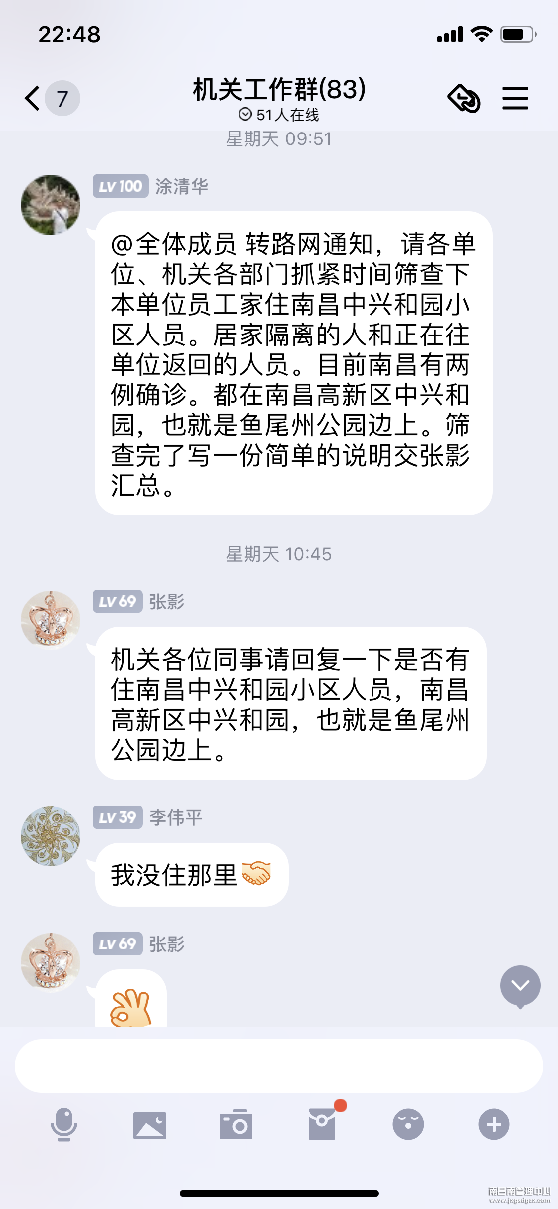 人员管控到位。及时掌控员工流动情况,严格落实人员排查制,要求3月8日起去过新建区的人员及时进行核酸检测;进一步落实疫情防控的属地管理,家住新建区的员工如在单位则暂缓回家,在家休假员工则按政府防疫要求居家隔离;严格落实“日排查”机制,要求居家人员每日汇报居家动态,坚持非必要不外出政策,明令禁止职工到疫情中高风险区。