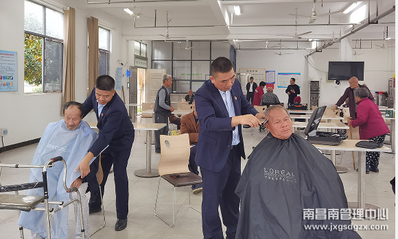 据了解,东乡区孝岗敬老院中心共有46位老人,主要是以智障、孤寡、高龄人群,大部分生活不能自理,他们更需要社会的关心关爱。党员们的到来,让平日里安静的敬老院变得热闹起来,党员们为老人们送上了牛奶、饼干,与老人们围在一起拉起家常,了解他们的身体状况,日常生活等。随后党员示范岗理发师们自带理发工具为敬老院不方便的老人义务理发,理发师和老人们一一打过招呼后,就开始进入了工作状态,拿起剪刀、推子开始为老人们理发,娴熟的技艺、细致的修剪,很快就让老人原本稍显凌乱、斑白的头发变得干净、整齐,看上去容光焕发。