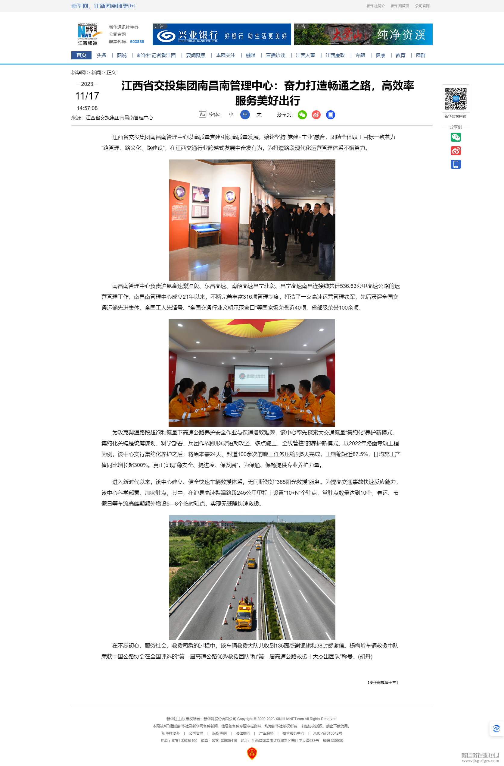 江西省交投集团南昌南管理中心:奋力打造畅通之路,高效率服务美好出行-新华网 http://www.jx.news.cn/20231117/3a4b880e26254128b95dbac5d4906182/c.html