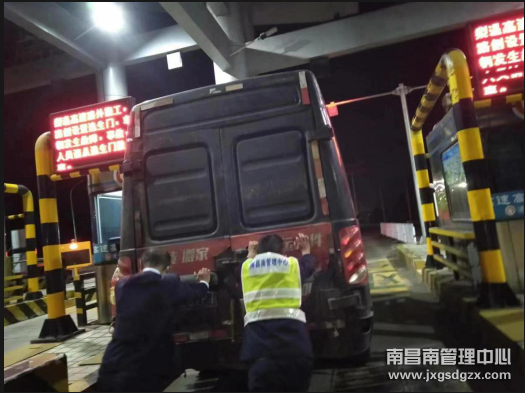 6月16日深夜十点多,一辆深色厢式货车车驶入南昌南管理中心进贤收费站,当班班长巡视车道时发现该车发出异常的声音,且栏杆起杆后车辆长时间未驶离车道,便走上前询问,在交谈中得知车辆出现故障,车主不敢贸然行驶。