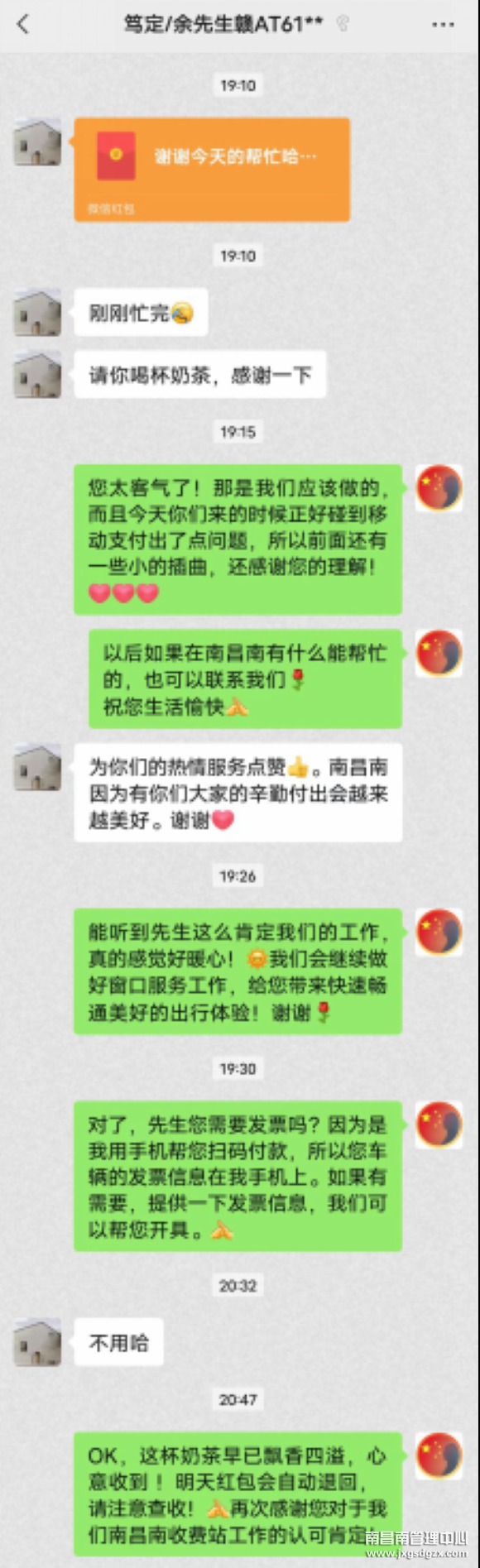 5月24日下午15:06 赣AT61** 黑色小轿车停在南昌南收费站111#岗亭缴费,兴国南站—南昌南收费站在报价通行费147元后,翻遍车内只找到145元的费用,考虑到车流量较大,为保证通行道口的车道畅通,此时正值收费站值班站长在车道处置现场,第一时间赶到主动自掏腰包,垫付剩余的通行费!
