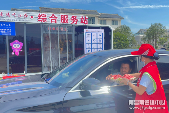 在服务站现场,志愿者热情地招呼着出行司乘,为大家送去西瓜、纯净水、高速公路安全行车手册等,同时为过往驾乘人员提供路况指引、收费政策咨询、车辆安全隐患排查以及指引驾驶员停车休息等服务举措。