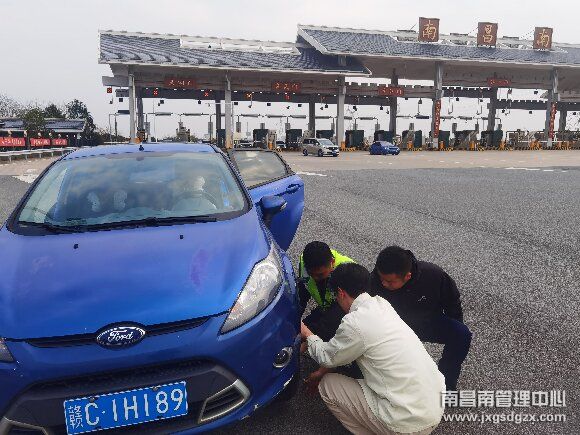 3月10日,南昌南收费站当班班长在巡视车道时,发现一辆蓝色小轿车打着双闪灯停在出口广场,发现这一不寻常的情况后,当班班长立即上前询问后得知:车主姓乐,因为周末着急来南昌办事,出发前没有及时检查车况,车子刚走到这里就爆胎了。了解情况后,当班班长立即将爆胎车辆推至广场边缘的安全地带,并从综合服务站里取来换胎工具帮助司机更换备胎,在确认司机备胎正常的情况下,经过十几分钟的努力,终于成功为司机更换好了备胎。