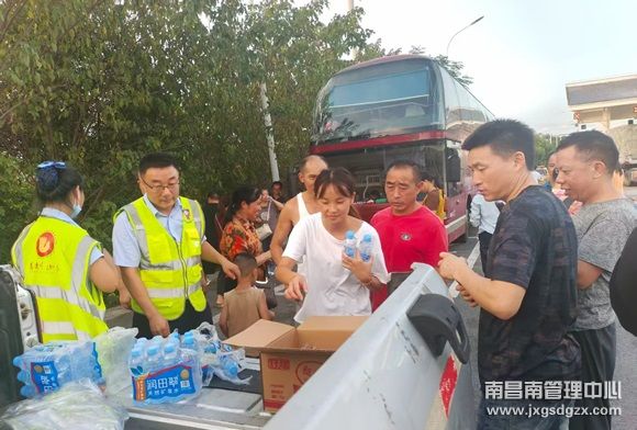 片刻功夫,值班站长便带领几名工作人员提着物资赶来。他们手中拎着沉甸甸的袋子,里面装着矿泉水、饼干,还有刚从冰箱里取出、带着阵阵凉意的西瓜。“天这么热,大家肯定渴坏了,先喝点水,吃点东西垫垫肚子,我们已经帮你们联系维修人员了,很快就到。”值班站长将物资递到司乘人员手中,话语简单却充满力量。