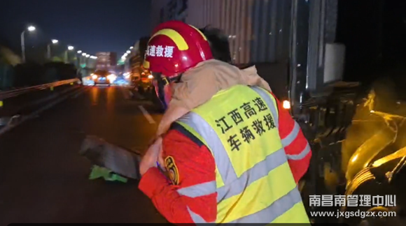 3月24日凌晨4时50分,沪昆高速上海方向K519一辆冷藏车发生侧翻,造成车道堵塞。与此同时,后方K521公桩处发生两辆大型货车追尾,1名驾驶员右大腿骨折被困驾驶室,情况紧急,南昌南车辆救援大队杨梅岭中队紧急出动,成功解救驾驶员并恢复路面通行。